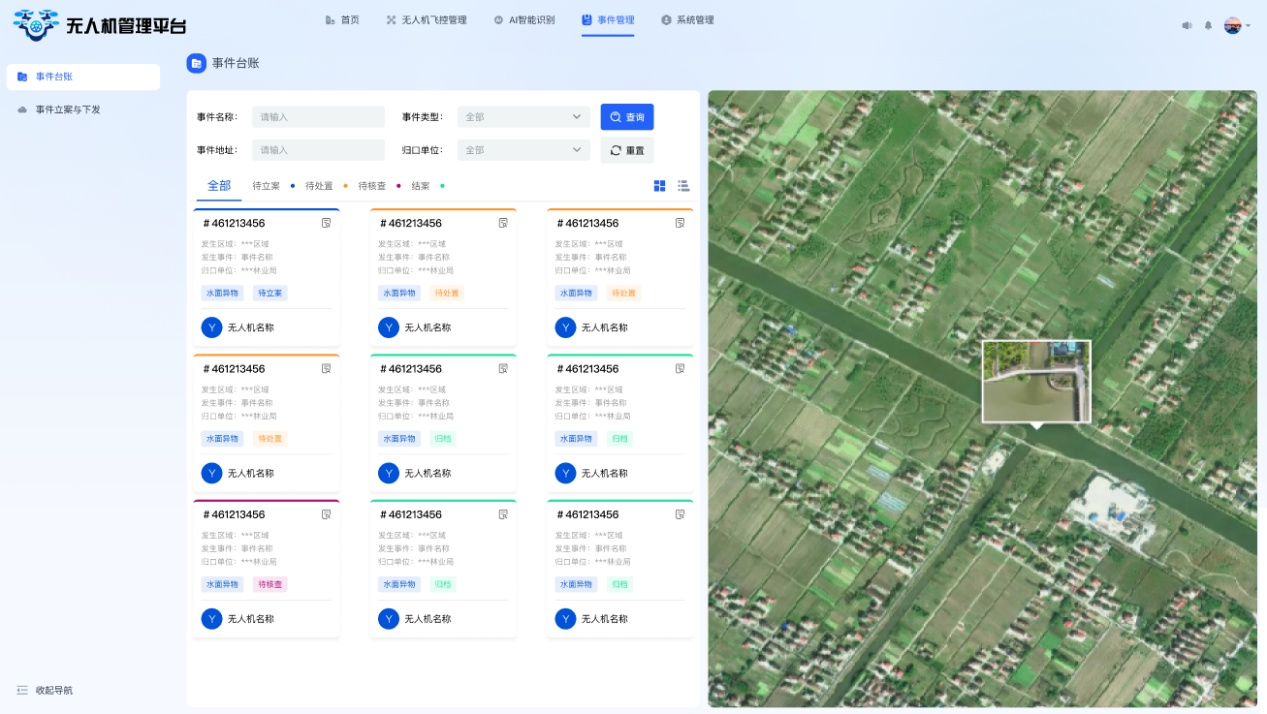 该模块集成八大核心功能,全面支撑事件全生命周期管理。事件台账功能实现事件数据的标准化存储与动态更新;事件立案与下发功能确保任务精准指派、责任到人;事件处置功能支持现场情况实时记录与反馈;事件核查功能通过无人机复查验证处置成效;事件结案功能完成信息归档,形成完整档案;事件查询功能支持多维度组合检索,快速定位目标事件;事件上图功能采用不同图标和颜色,在地图上分层展示事件分布;事件详情查看功能可一键查阅事件处理全流程信息,实现透明化管理。通过这些功能,平台有效提升了跨部门协同效率与事件处置规范性。
