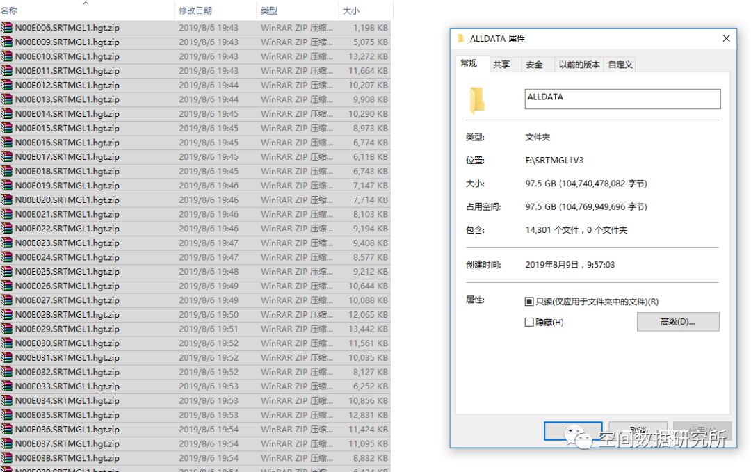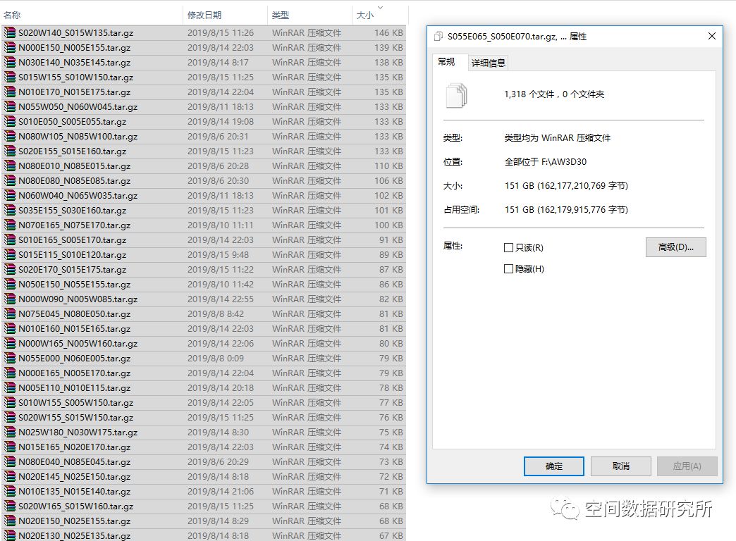 如果需要下载数据可以直接访问LD DAAC直接下载分幅数据包,这个是一个FTP服务器,注册后可以直接分幅下载,然后自己进行拼接即可。全球范围一共22608个文件(没有官方文档提到的22912,目前不知原因),共计373GB,如果大家有需要可以关注公众号“空间数据研究所”,不超过一个省的话会直接发给大家,主要是网络压力有点大。