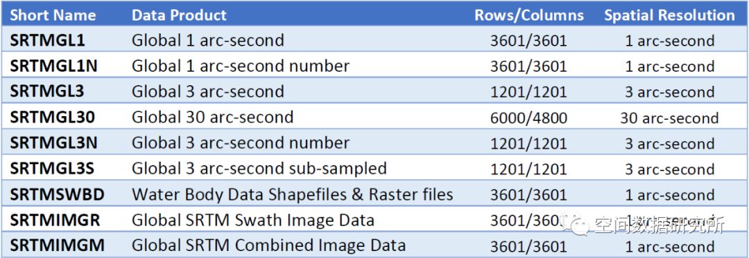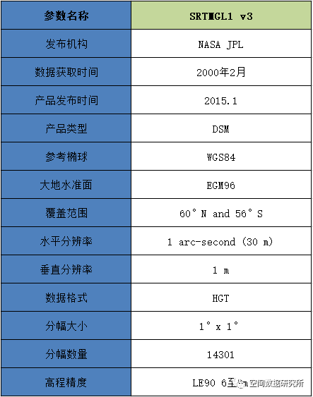 为了继续保持在全球DEM数据领域的领先,NASA借助最新的项目MEaSUREs (Making Earth System Data Records for Use in Research Environments)着手升级SRTM DEM数据产品,这次升级工作又回到JPL手中,JPL接手后先对数据错误进行了修正,发布了v2.1版本,随后发大招,融合ASTER GDEM v2、USGS GMTED2010、USGS NED(National Elevation Dataset)数据,于2015年10月发布了SRTM Plus即v3版本产品,SRTM Plus所有数据向全球用户免费开放下载使用,包括SRTMGL1、SRTMGL3和SRTMGL30三种不同的分辨率的全球DEM数据产品,其基本属性如下