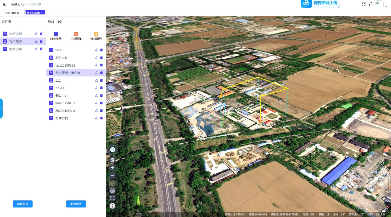 巡航管理模块为无人机飞行任务提供全流程管控,涵盖航线管理、任务管理和禁飞区管理三大功能。航线管理支持新增、导入或手动绘制航线,可精细化设置飞行高度、速度、摄像头角度及任务完成动作;任务管理允许用户定义任务名称、选择航线、指定设备、设定执行策略与时间,无人机按预设要求自动执行巡航任务;禁飞区管理支持导入或手动绘制禁飞区域,确保无人机飞行过程中自动规避敏感地带,保障飞行安全与合规。在与山东省国网电力的合作项目中,该模块实现了输电线路建设的过程监控、进度跟踪和环保预警,大幅提升了电力设施运维效率。