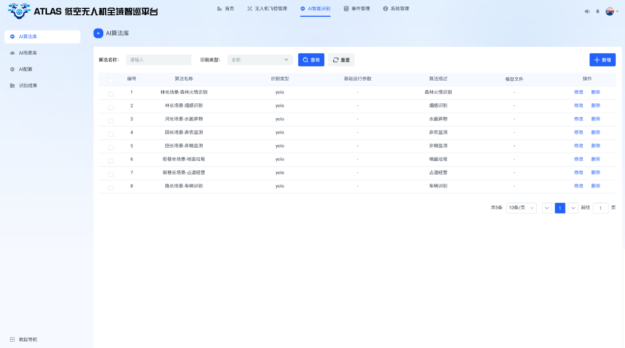 AI识别模块整合算法库、场景库、配置功能和识别结果管理四大子功能,构建起“算法—场景—设备—成果”的全链路闭环体系。算法库实现对各类识别算法的统一管理,支持算法新增、编辑、删除与版本控制,涵盖森林火情识别、水面异物检测、非农化监测等十余类核心算法;场景库针对“五长制”不同业务领域,预设适配的算法组合,支持场景描述维护、适用区域设定和识别阈值调整,实现“一场景一策略”的精细化识别;AI配置功能可将场景算法灵活绑定至指定无人机,设置巡检范围、频次、灵敏度等参数,支持远程下发与动态更新;识别结果管理模块对识别事件进行结构化存储,通过缩略图预览、高清图像下载和地图空间化展示,直观呈现事件分布趋势,联动事件管理模块启动处置流程。